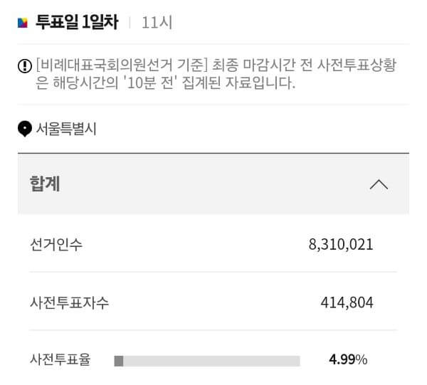 예시로 격전지인 서울특별시의 종로구를 확인해 보면 사전투표 첫날인 5일 오전 11시 기준으로 선거인 126,543명 중 7,630명이 사전투표해서 종로구의 사전투표율은 6.03%를 보이고 있습니다.